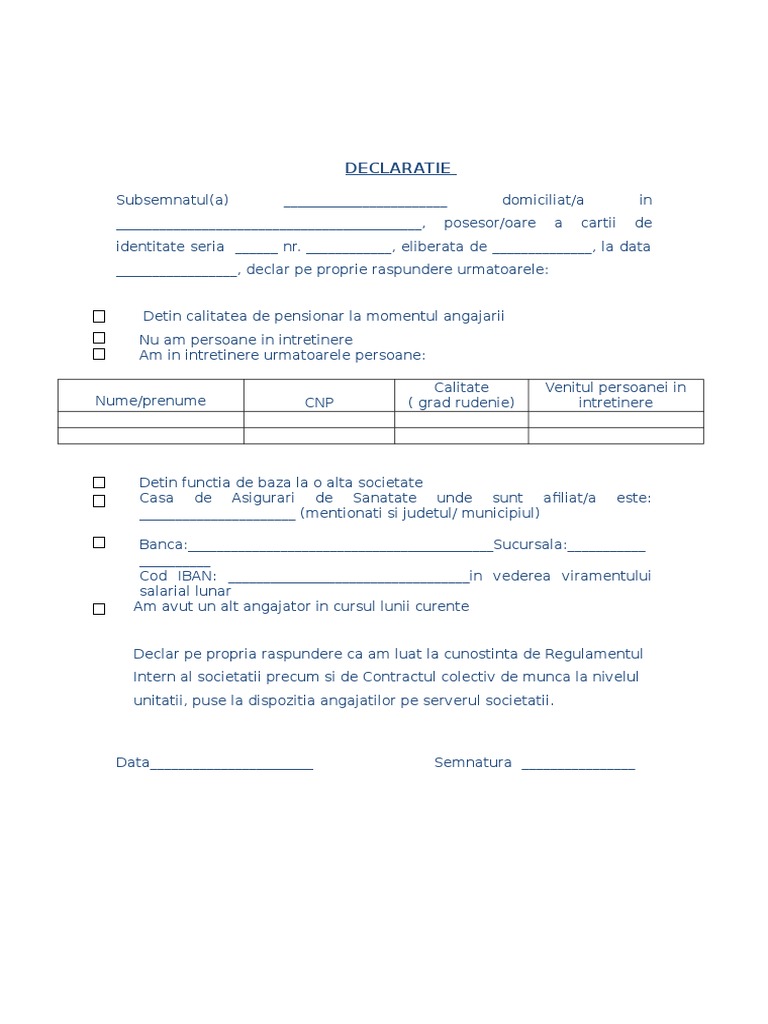 Multumim guvernului pentru aceste masuri si in special pentru aceasta declaratie pe propria raspundere. Iată modelul declaraţiei pe propria răspundere pentru părăsirea localității carantinate. Având în vedere că starea de alertă a fost prelungiră cu încă o lună și noile restricții au intrat în vigoare, românii trebuie să aibă asupra lor un nou document când se deplasează pe timpul nopții. Printre măsurile explicate de către șeful guvernului se numără și interdicția circulației pe timpul nopții. De duminică seară, începând cu ora 22:00, intră în vigoare restricțiile de călătorie, potrivit noilor reglementări care vizează starea de … Autoritățile române au publicat noul model de declarație pe propria răspundere necesar pentru a circula în localitățile în care sunt în vigoare restricții de circulație după ore 20:00. Declaratie pe propria raspundere simpla author: Folosind modelul de mai jos veti ramane complet in legalitate si politistii nu va vor sanctiona pe motive de necorcondanta. am restricţii medicale care mă împiedică să prestez o anumită muncă, după cum urmează**): Declaratie pe propria raspundere model actualizat stiri oficiale formular de completat tipizat digital cerere electronica coronavirus romania 2020 pe telefon smartphone android si ios iphone online gratuit pentru iesire din casa control politie ordonanta militara nr. Regimul juridic aplicabil pentru reducerea saptamanii de lucru. Ddtele personale nu sunt prelucrate de către sts. Prezenta, pe propria răspundere, că*):